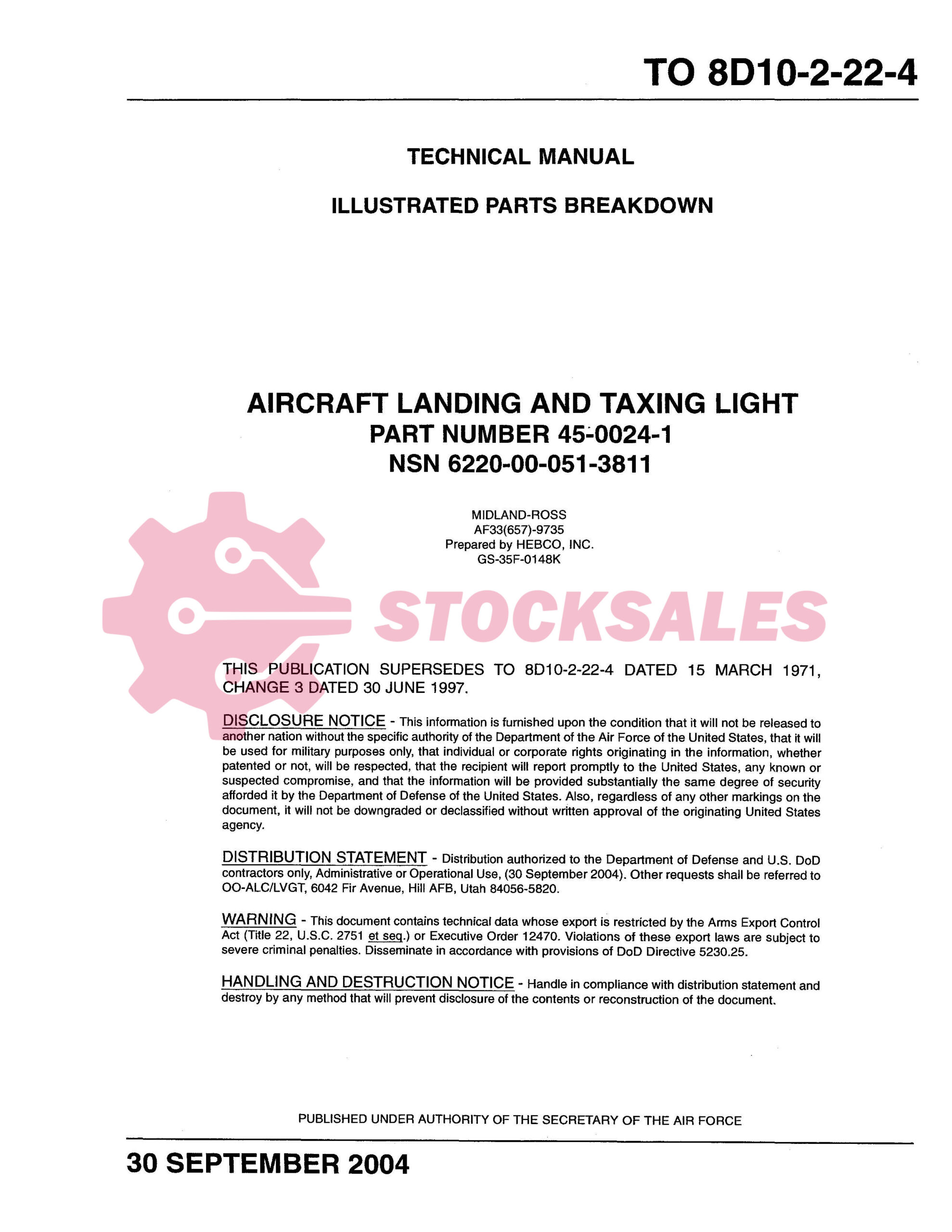 TO Number: TO 8D10-2-22-4 – AIRCRAFT LANDING AND TAXI LIGHT – ILLUSTRATED PARTS BREAKDOWN (IPB) for Part Numbers: 45-0024-1, 6-60906-1, 1846-1