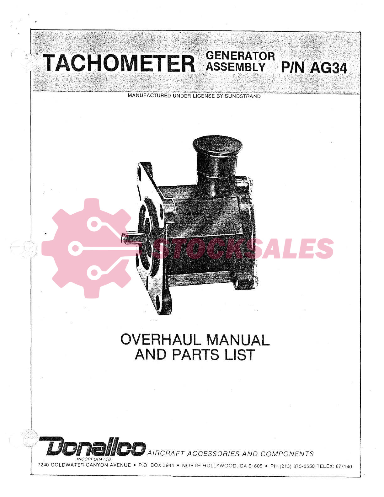 This manual provides complete overhaul instructions and a detailed parts list for the Donallco Tachometer Generator Assembly, Part Number AG34. It outlines disassembly, inspection, testing, and reassembly procedures to ensure accurate speed signal output and dependable performance. Designed for aviation maintenance professionals, it supports precise servicing and component replacement in compliance with aerospace standards.