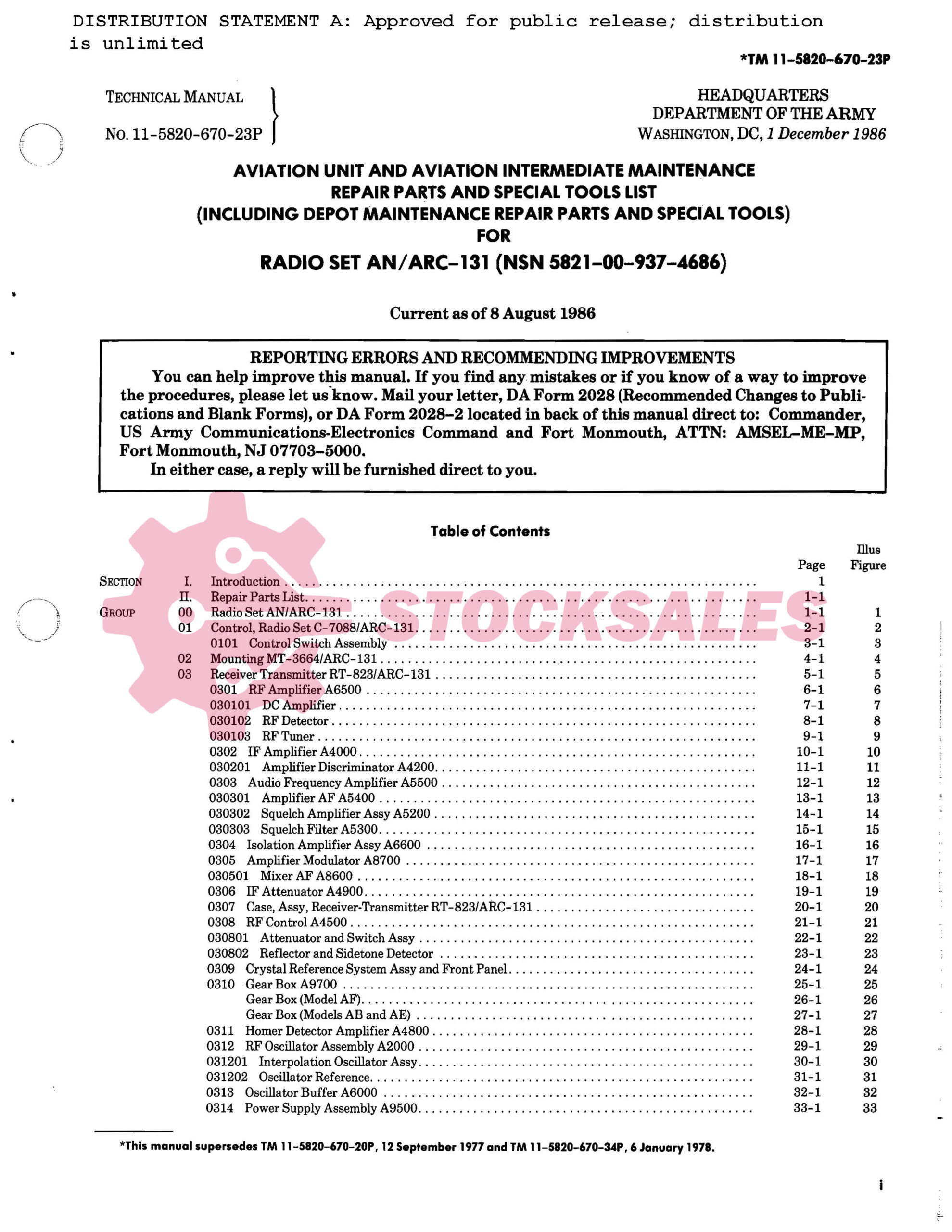 TO Number: TM 11-5820-670-23P – RADIO SET AN/ARC-131 AVIATION UNIT AND INTERMEDIATE MAINTENANCE REPAIR PARTS AND SPECIAL TOOLS LIST for Part Numbers: AN/ARC-131